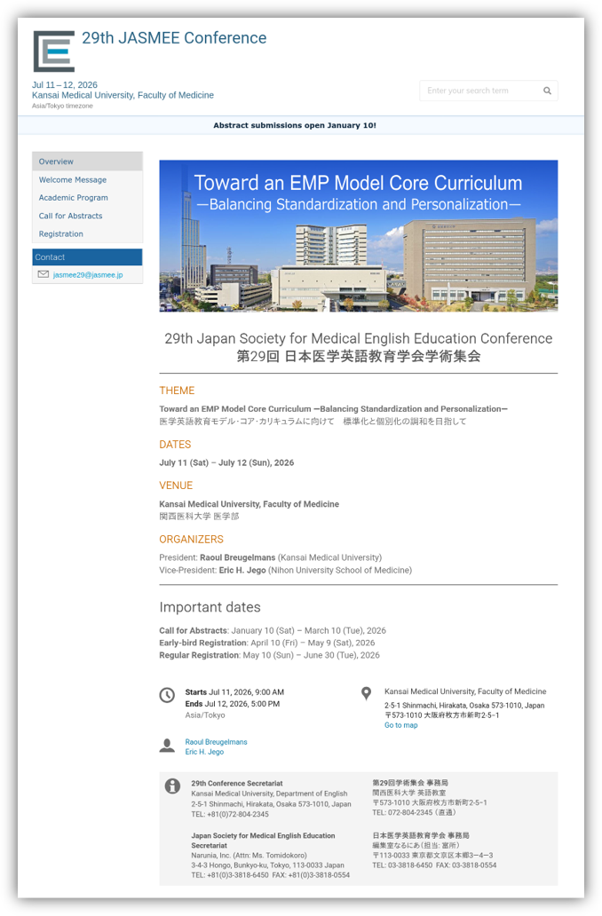 It is my great pleasure to announce the 29th JASMEE Conference. For the first time, the annual conference will be supported by a dedicated conference website, through which abstract submission, participant registration, and payment of registration fees will be conducted. Please note that all participants will be asked to create a free account on the conference platform. The conference program, book of abstracts, and other related information will be available via the website and an accompanying mobile app for Android and iOS.